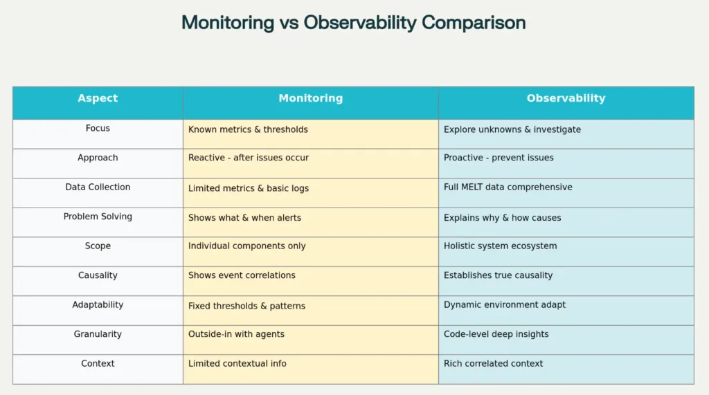 Key differences between traditional monitoring and observability approaches in IT systems management.