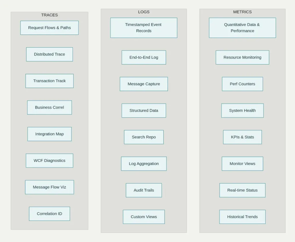 The three pillars of observability and Nodinite’s implementation of each pillar.