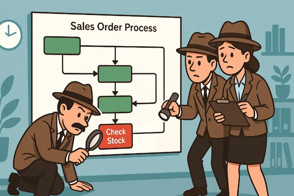 If you noticed the red “Check Stock” milestone, that’s where the failure happened. For an unknown reason, the stock-checking stage threw an error, causing the entire sales order to stall. Without timely correction, the order will never be shipped, and a few days later, customer service may receive a frustrated call asking, “Where are my shoes?”