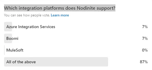 The poll question for September was “Which integration platforms does Nodinite support?”. For this we are pleased to see that there was plenty of engagement.